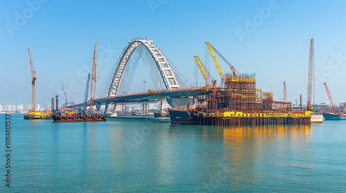© pinporn manosri, Obraz premium Construction of a Modern Bridge Over Water with Cranes, Barges, and Workers under a Clear Blue Sky in an Urban Landscape