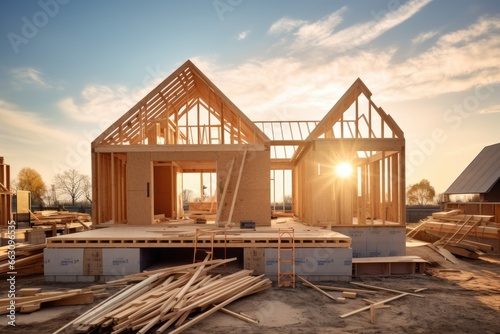 © Iftikhar alam, Fototapeta premium Construction of a new house in the form of a wooden frame, Construction of a new house. Construction of a new house with a wooden frame, AI Generated