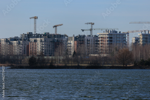 Naklejka premium Construction of buildings and high-rise cranes against the sky