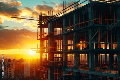 © MahmudulHassan, Obraz premium Construction of large residential buildings with crane at sunset