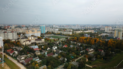 © f2014vad, Fototapeta premium Construction of modern multi-storey buildings. Construction of a new city block. Buildings under construction and tower cranes. Aerial photography in cloudy weather.