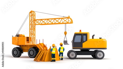Fototapeta premium Construction Scene with Yellow Crane and Workers on White Background