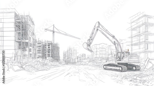 © lestari, Obraz premium Construction site blueprint, excavator, architectural design