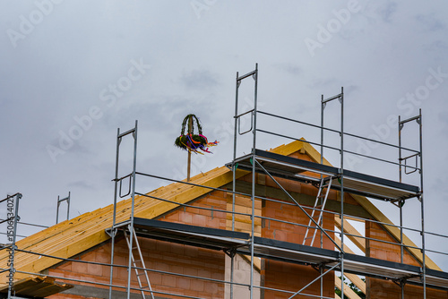Fototapeta premium Construction site featuring roof finishing with decorative wreath