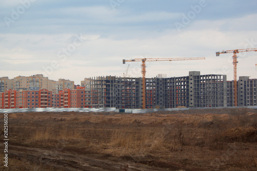 © Ivanna, Obraz premium Construction site including several cranes working on a building complex.