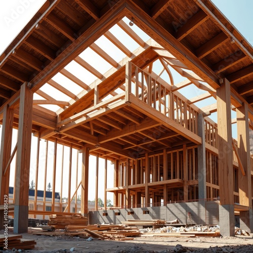 Fototapeta premium Construction site showcasing modern building framework wood concrete design...