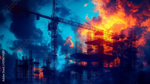 © 海翰 章, Fototapeta premium Construction site with a building under development, a tower crane, and heavy machinery at sunset, symbolizing urban growth, industrial progress, and modern infrastructure.