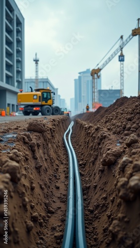 © BELLAMKONDA SOWJANYA, Obraz premium Construction site with trenches for laying pipes