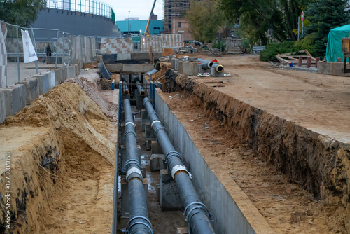 Fototapeta premium Construction site with underground utility work in a city area during autumn