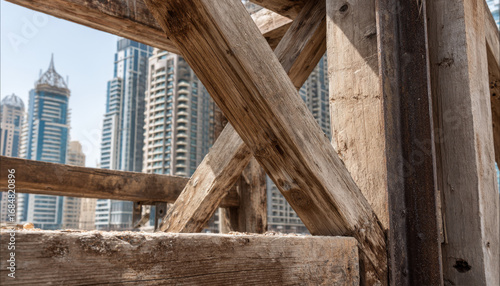 Obraz premium Construction site with wooden scaffolding against city skyline during daytime in a modern urban environment