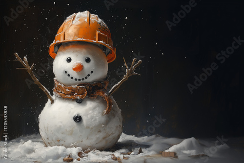 Fototapeta premium Construction snowman wearing a hard hat and scarf for themed poster