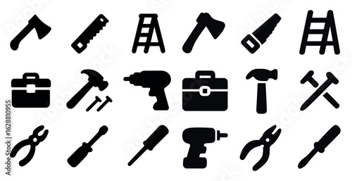 © Coosh448, Obraz premium Construction tools flat icons set – solid, filled, tool and equipment symbols