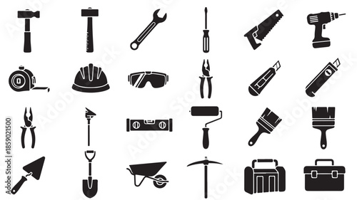 © MdAbdullah, Obraz premium Construction Tools Icons Set in Simple Monochrome Style with Black Silhouettes on White Background for Graphic Design