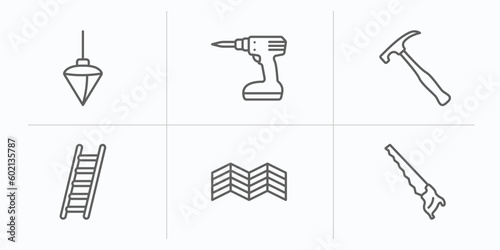 Fototapeta premium construction tools outline icons set. thin line icons such as plumb bob, cordless drill, brick hammer, ladder, parquet, hand saw vector.