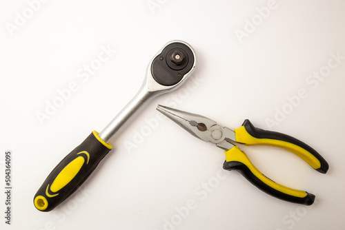 © Tetiana Romaniuk, Obraz premium Construction tools, wrench heads on white background