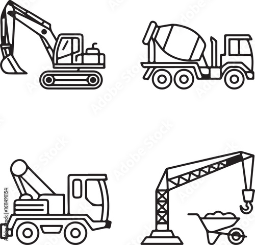 Naklejka premium Construction Vehicle Icons A collection of simple line drawings featuring an excavator cement truck crane truck and tower crane with wheelbarrow perfect for construction themes