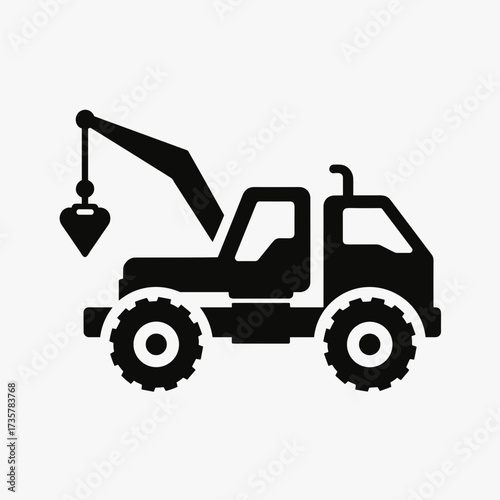 Naklejka premium Construction vehicle silhouette on white background showing crane. Construction vehicle for lifting tasks in the building site features a large pendulum and black frame.