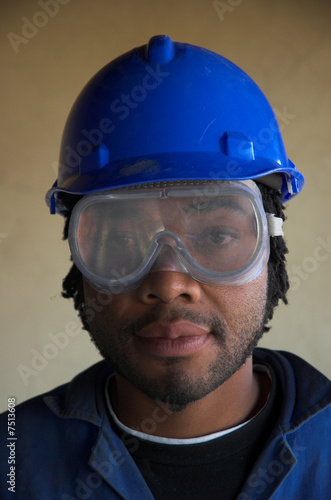 © StockMasters, Fototapeta premium Construction worker and eye face mask