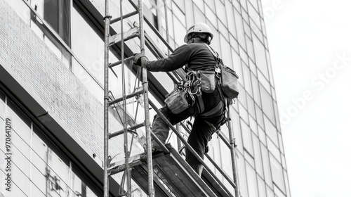 Fototapeta premium Construction Worker Ascending Scaffolding on a Modern Building