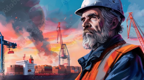 © Ekkarat_Studio, Fototapeta premium Construction Worker at Sunset with Cranes - Safety Vest and Hard Hat Standing Amid Construction Activity