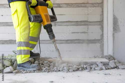 © Nibir, Fototapeta premium Construction worker breaks up concrete with a powerful jackhammer