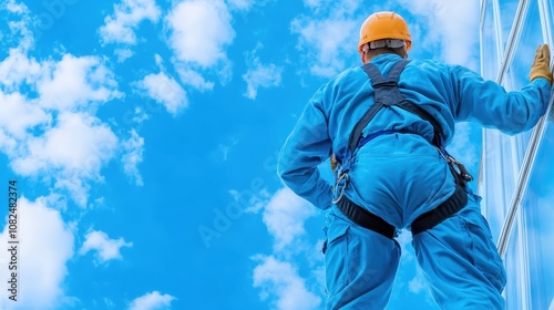 Obraz premium Construction Worker in Safety Harness Cleaning Glass on High Rise Building Against Bright Blue Sky with White Clouds, Showcasing Safety and Professionalism in Urban Environment