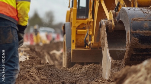 © LorelEino, Fototapeta premium Construction worker operating a backhoe at a digging site. Featuring construction machinery and site excavation