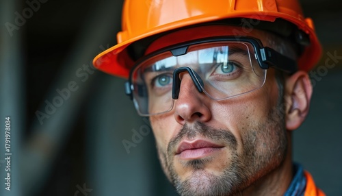 © Pete, Fototapeta premium Construction worker portrait, close up blue eyes, orange helmet, safety glasses. Man looks focused on site task, ready for work. Hard labor details visible.