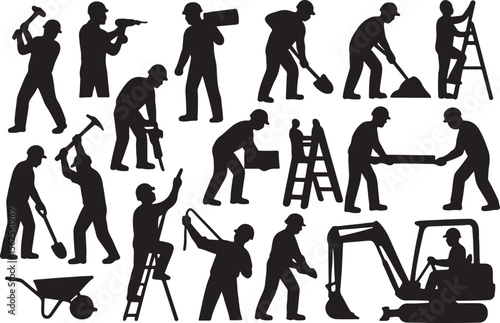 Obraz premium Construction Worker Silhouette Set – Labor and Building Activity Icons