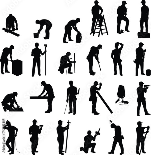 Obraz premium Construction worker silhouettes set, labor, building, engineering, craftsmanship, teamwork, industry, tools, repair, measurement, trade, occupation, site