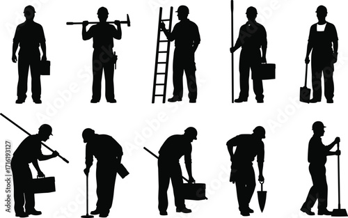 Obraz premium Construction worker silhouettes with tools and gear, ideal for labor,...