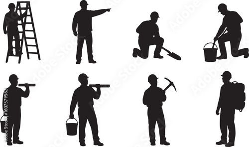 Obraz premium Construction worker silhouettes with tools and ladder, construction worker, silhouette, worker, building, construction, ladder, pickaxe, shovel, bucket, tools, safety helmet, pointing, digging, carryi