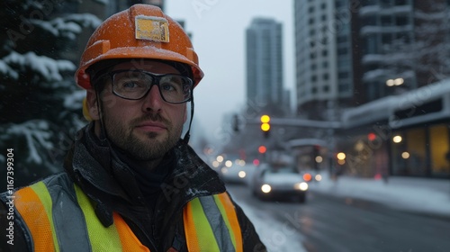 © talkative.studio, Obraz premium Construction Worker Stands In Snowy City Street