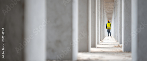 © perfectlab, Fototapeta premium Construction worker walking through concrete pillars