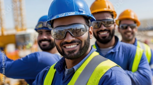 © Narongsag, Obraz premium Construction Worker Wearing Hard Hat and Safety Glasses Smiling