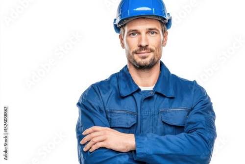 Fototapeta premium Construction worker wearing hardhat smiles confidently