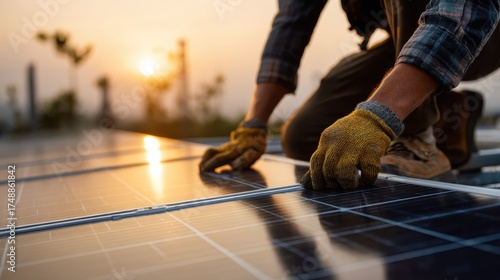 Fototapeta premium Construction worker wearing safety gloves installing solar panels on a residential rooftop while adjusting photovoltaic cells to support renewable energy transition and efficient home electricity use.