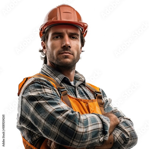 © stockphoto02, Fototapeta premium Construction worker with safety equipment renovates building on Labor Day.