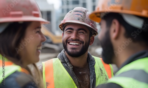 Obraz premium construction workers are wearing dirty safety vests and hard hats showing...