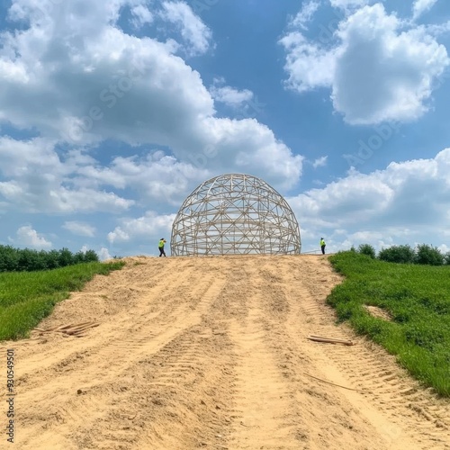 © Mykhailo Podolian, Obraz premium Construction workers inspecting a large geometric structure under a bright sky