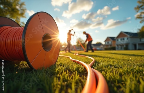 © Viktor, Obraz premium Construction workers install fiber optic cable outdoors during golden hour. Teamwork focuses on infrastructure project, connecting homes with advanced technology. Rural setting modern telecom