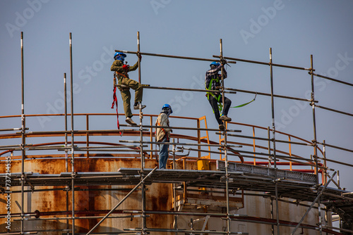 Fototapeta premium Construction workers installing scaffolding storage tank Oil​ refinery​ and​...