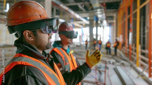 © Imsuniyah, Obraz premium Construction Workers Using Augmented Reality Headsets on a Construction Site