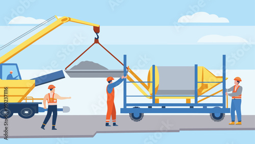 Naklejka premium Construction workers using crane to move materials and cement mixer on a...
