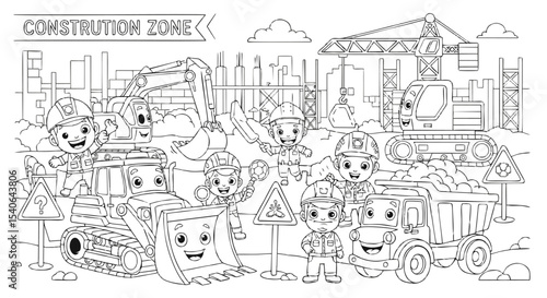 Fototapeta premium Construction Zone Coloring Page: Happy Kids and Machines
