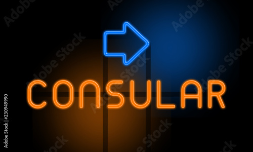 © Hepta, Fototapeta premium Consular - orange glowing text with an arrow on dark background