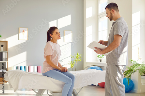 © Studio Romantic, Obraz premium Consultation for manual therapy rehabilitation, massage, male physical therapist in therapy medical clinic room. Female patient med coach sitting to reduce disability, pain, get body health, wellness