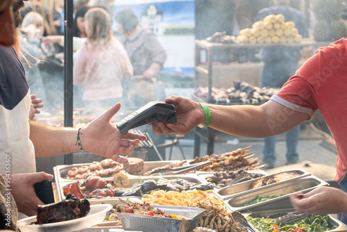Fototapeta premium contactless payment transaction at an outdoor food stall. customer holds a payment terminal while another person prepares to tap their card.scene captures a modern and cashless payment method.