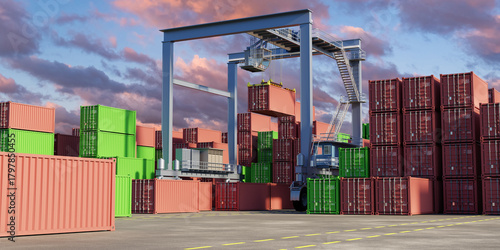 © Grispb, Obraz premium Container crane lifting cargo containers in a busy shipping yard at sunset, representing logistics, transportation, export, import and global trade operations. 3d image.