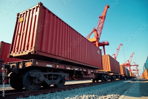 Obraz premium Container hoisted onto rail car at port terminal, port, cargo
